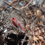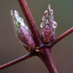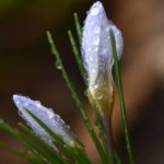 Soft, cool rain falls as I lay on wet leaves photographing said crocus flowers. They are closed tight and covered in dewy raindrops that make them look all that more beautiful. Scraggly reddish brown clematis vines are covered in swelling buds and soon will be putting on a show. The unmistakable mating song of a cardinal echoes in the background as the frantic call of pileated woodpeckers flying from tree to tree emanates from the forest.