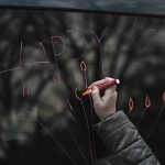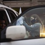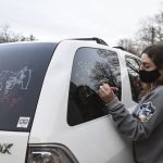 Talia Rosenthal of Squirrel Hill draws on a car window prior to the start of Chabad of Pittsburgh’s annual Grand Menorah Parade at Rodef Shalom in Shadyside on Tuesday, Dec. 15, 2020. The event was scaled back this year due to covid-19.
