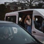 A person in a van tosses an item to someone in another car at the start of Chabad of Pittsburgh’s annual Grand Menorah Parade at Rodef Shalom in Shadyside on Tuesday, Dec. 15, 2020. The event was scaled back this year due to covid-19.