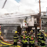 Two firefighters fell through the roof of one of the homes while battling the flames, said Matt Brown, chief of Allegheny County Emergency Services.