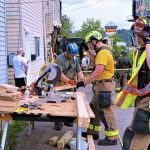 Firefighters set up a makeshift wood shop at the scene to fashion wood posts into columns to support the building.