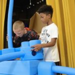 The first students to play with the blocks quickly divided into smaller groups to build structures and contraptions.