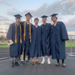 Courtesy of Tina Gillen Emma Martin, Mary Grace Seymour, Marshall Mao, Class of 2020 Valedictorian Nandini Rastogi and Grace Fleury pose for a photo following the July 24, 2020, phased commencement ceremony at Franklin Regional High School’s Panther Stadium in Murrysville.
