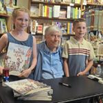 Chloe Johnson, 12, and Caleb Johnson, 10, of Ross Township pose for a photo with writer Jerry Spinelli during a book signing June 2, 2019 at Riverstone Books.