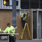 Pittsburgh Public Works employees board up the Pittsburgh Police Zone 2 substation at Liberty Avenue and Sixth Street Downtown on Sunday a day after violence erupted during the protests over the death of George Floyd. Police and protest organizers say those who burned vehicles and destroyed property likely were from out of the area.