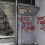 Spray-painted messages are seen outside a store on Wood Street in Downtown Pittsburgh on Sunday a day after violence erupted during the protests over the death of George Floyd. Police and protest organizers say those who burned vehicles and destroyed property likely were from out of the area.