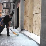Maintenance worker Matt Demitras shovels broken glass outside a GNC store on Wood Street in Downtown Pittsburgh on Sunday a day after violence erupted during the protests over the death of George Floyd. Police and protest organizers say those who burned vehicles and destroyed property likely were from out of the area.