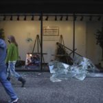 People walk by the busted window of the Wood Street Frame Shop in Downtown Pittsburgh on Sunday a day after violence erupted during the protests over the death of George Floyd.