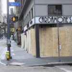A person walks past a boarded-up Cardamone’s salon at Wood Street and Forbes Avenue in Downtown Pittsburgh on Sunday a day after violence erupted during the protests over the death of George Floyd. Police and protest organizers say those who burned vehicles and destroyed property likely were from out of the area.