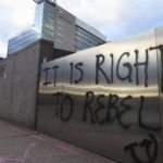 Spray-painted messages are seen outside the Steel Plaza light rail station in Downtown Pittsburgh on Sunday a day after violence erupted during the protests over the death of George Floyd. Police and protest organizers say those who burned vehicles and destroyed property likely were from out of the area.
