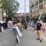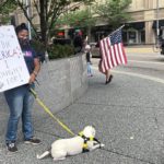 Blair Mickles, of McKeesport, stood with her dog Montana, holding a sign that said “This is the America I fought for.”