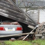 A garage collapsed and sent bricks and block onto the car parked inside when a tornado passed through Hampton on Thursday. A tree also landed on the roof of the home on the property. Utility crews were on scene early Friday morning restoring power after trees landed onto utility poles during the storm.