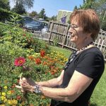 Greensburg Garden Center Co-President Carla Rusnica gathers a bouquet in the center’s Lefevre Butterfly Garden.