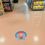 Plexiglass dividers provide some separation between cashiers and customers, and stickers on the floor at registers mark the six-foot distance customers should keep from each other.