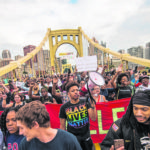 Protesters walk across the Roberto Clemente Bridge after congregating at the Wood St. T-Station Downtown protesting the shooting death of Antwon Rose by East Pittsburgh police on June 22, 2018.