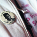 A demonstrator wears a button memorializing black motorist Jonny Gammage during a candlelight vigil in Brentwood, Tuesday, Dec. 16, 2014. Gammage died 19 years ago from asphyxiation due to pressure applied to the chest after an altercation with the police.