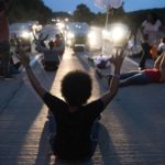 A woman raises her in front of stopped traffic after more than 150 people took over the Parkway East in both directions, Thursday, June 22, 2018 to protest East Pittsburgh police officer Michael Rosfeld East fatal shooting of 17-year-old Antwon Rose, a Woodland Hills High School honors student.