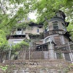 Pieces of the building’s facade appear to be crumbling, and a porch on the side of the structure has collapsed.