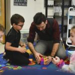 Shevan Abdulla sits on the floor inside a first-grade classroom at McClellan Elementary School constructing a colorful tower alongside student Santino Civitello.