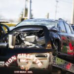 A vehicle involved in a two-car crash is loaded onto a tow truck on Thursdayon Freeport Road near Oak Manor Drive in Harrison.