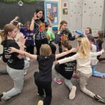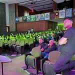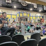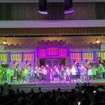 About 80 Highlands elementary and middle school students are awash in light as they and musical Director Michael Zeiler watch the cast of this year’s spring musical, “Descendants,” perform at the high school on Saturday, March 9, 2024.