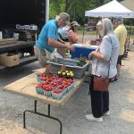 Jim and Kay Bridge, husband-and-wife owners of Bridge’s Farm in Plum, serve market shoppers at opening day of Plum’s Monday Market at Plum Creek Park on Monday, June 5.