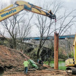 A construction crew is installing temporary shoring along Buffalo Creek at Freeport’s sewer plant so an Oakdale company can begin work on the first stage of the nearly $12 million renovation of the facility.