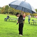 Max Strunk, 4, handled Saturday’s rainstorms at a church picnic in Washington Township by kicking off his shoes and grabbing an umbrella.