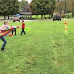 Emma Strunk, 9, takes aim with a Frisbee she is trying to toss through a ring during a community picnic on Saturday sponsored by the Community Church of Pine Run in Washington Township.