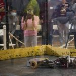 In one corner, robots fought in an industrial enclosure reminiscent of a boxing ring. Loud clanging noises could be heard from the ring as the bots, armed with wheels and weapons, crashed into each other and the ring’s barriers.