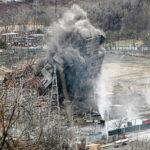 A cloud of dust is seen as the remaining portion of the boiler house at the former Cheswick Generating Station is pulled down Saturday, March 8.