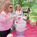 Angela Occhipinti (left) and Pam Seguin prepare strawberry shortcakes for those attending the Strawberry Festival at the Burtner House in Harrison on Saturday.