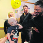 Rocco Monteleone, 2, of Harrison City, held by mother, Michelle, bumps elbows with WWE’s Roman Reigns as other Superstars Natalya and Seth Rollins look on during a visit to UPMC Children’s Hospital of Pittsburgh on Monday, March 12, 2019.