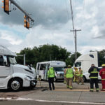 The bus was pushed into the westbound lanes, where another tractor-trailer and a car stopped for the light became involved, state police said.