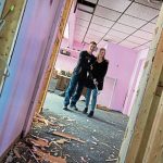 Last Friday, a work crew was busy doing demolition work. Lisa Rivardo was only too happy to do her part, sinking a sizable hammer into a bright pink wall that’s coming down.