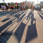 Two counter-protesters were initially standing near the police station with an “All Lives Matter” sign, and the two groups interacted peacefully when they briefly occupied the same corner.