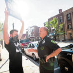 An officer with the Greensburg Police Department speaks to protesters on the sidewalks in front of the Westmoreland County Courthouse on Thursday, Aug. 20, 2020 in Greensburg.