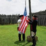 Dan Balzarini (left) and Thomas Klingensmith of Proctor’s Militia raise the flag. Kristina Serafini | Tribune-Review