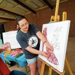 Seton Hill University art therapy major Bethany Rice shows guests how to apply a yarn string to a shoe design for the 12th annual Westmoreland County Walk A Mile In Her Shoes on Saturday, April 15, 2023 at St. Clair Park.