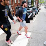 Pitt-Greensburg third year student John Tomasic crosses the street in red high heels while participating with fellow classmates in the 12th annual Westmoreland County Walk A Mile In Her Shoes on Saturday, April 15, 2023 in downtown Greensburg.