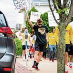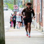 Seton Hill University offensive lineman and senior Kai Marshall, walks in high heels in downtown Greensburg on Saturday, April 15, 2023 for the 12th annual Westmoreland County Walk A Mile In Her Shoes.
