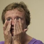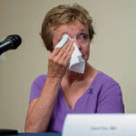 Christine Lieb of Scottdale wipes her tears as she talks about her experiences in receiving a new treatment for Alzheimer’s during a news conference at Westmoreland Hospital in Greensburg on Wednesday.