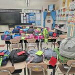 Backpacks holding gifts and essential items raised during a gift drive sit on students’ desks at Logan Elementary School in North Versailles in December .