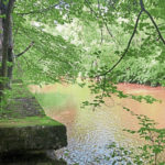 Brush Creek in South Trafford Park runs a brownish-orange color from the presence of iron sulfide, or pyrite, from an abandoned mine that has leached into the stream.