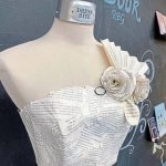 She created the upper half of the dress by using Mod Podge to stick the pages to the bridesmaid dress.