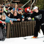 Pro skier Bobby Sullivan of Boston, Mass., greets young fans after riding the rails during the qualifying round of competition in the first Steel City Showdown, a freestyle skiing event hosted by Pittsburgh native and world-famous freestyle skier Tom Wallisch, on Saturday, Jan. 11, 2020 at Seven Springs Ski Resort.