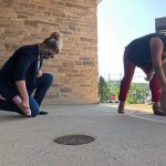 Excela Westmoreland employee Kelly Bedner fills cracks outside the emergency department as part of the Red Sand Project on Thursday. The project draws attention to human trafficking.