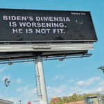 About 100 yards away in the same lot, a digital billboard facing westbound traffic flashes ads for restaurants, a construction company and a nursing service amid admonitions to “read the Bible” and an attack message reading “Biden’s dimensia [sic] is worsening. He is not fit.”