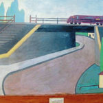Student artwork from Manor School includes one labeled subway and showing a train moving on an overpass. Stairs lead up to the top on the left side of the painting.