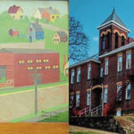 A side-by-side photo of Manor School. The painting was done during the 1943-44 school year. The photo is what the school looks like today.
